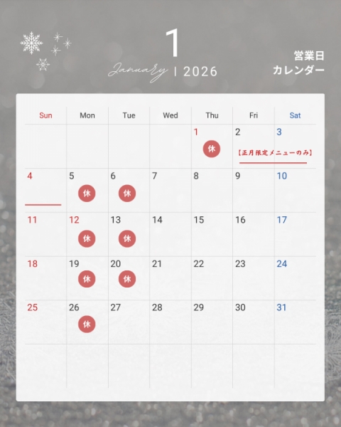 ※ 1月13日(火)はイレギュラーでのお休み となります。